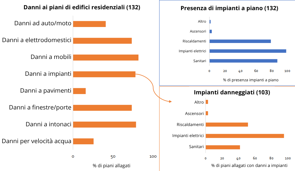 Nel grafico: a sinistra la percentuale di danni residenziali per tipologia con una specifica relativa ai danni ai "sistemi" (ascensori, di riscaldamento, elettrici, sanitari, altro). Per questi è riportata in alto a destra anche la loro percentuale di presenza.