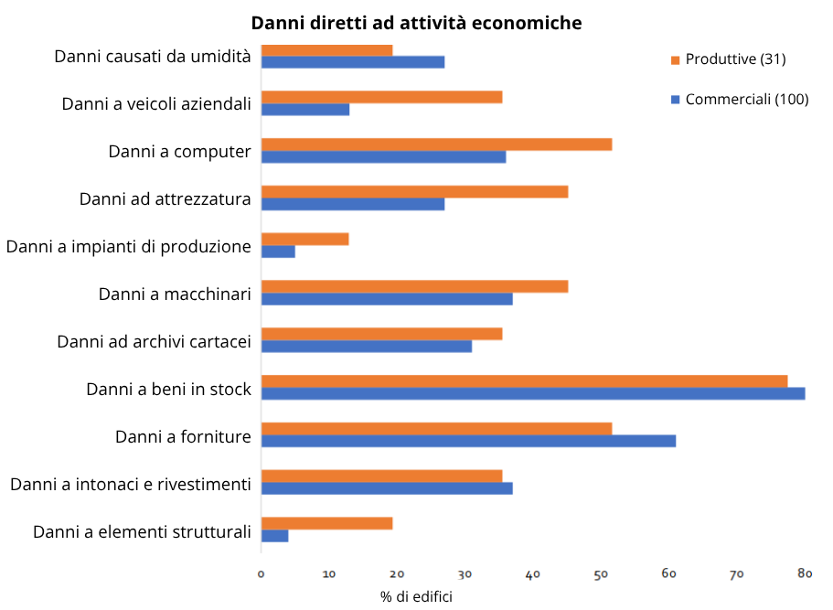 Nell'immagine a destra i danni diretti divisi per tipologia (ai veicoli, alle attrezzature informatiche, ai macchinari, ecc.). Per ogni voce è distinto se il danno ha colpito un'attività produttiva o un'attività commerciale.