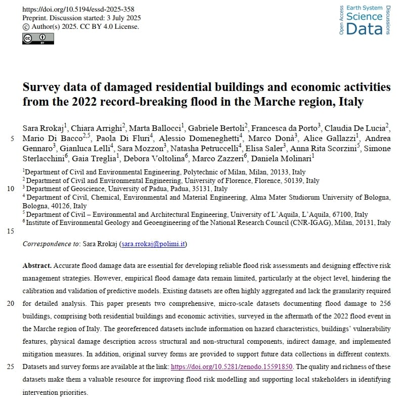 Il paper Survey data of damaged residential buildings and economic activities from the 2022 record-breaking flood in the Marche region, Italy presenta dati empirici dettagliati sui danni a edifici residenziali e attività economiche, rilevati a seguito dell’evento alluvionale del 2022 nella regione Marche. La risorsa è utile perché generalmente i dataset esistenti sono spesso altamente aggregati e privi della granularità necessaria (per esempio a livello di singolo edificio) per analisi dettagliate. Il documento presenta due dataset completi a scala microscopica che documentano i danni da alluvione a 256 edifici, comprendenti sia abitazioni residenziali sia attività economiche. I dataset includono informazioni sulle caratteristiche dell’evento, le vulnerabilità degli edifici, la descrizione dei danni fisici a componenti strutturali e non strutturali, i danni indiretti e le misure di mitigazione adottate.