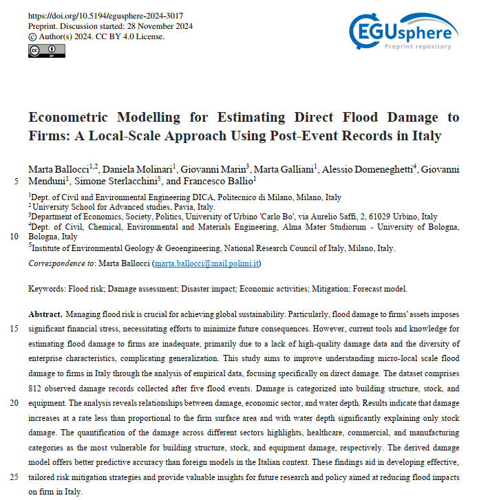 Il paper Econometric Modelling for Estimating Direct Flood Damage to Firms: A Local-Scale Approach Using Post-Event Records in Italy sviluppa un modello previsionale per stimare i danni diretti delle alluvioni alle attività economiche italiane a microscala. L'esigenza nasce dalla carenza di strumenti affidabili per valutare i danni alle imprese, principalmente dovuta alla mancanza di dati di qualità e alla diversità delle caratteristiche aziendali. Sono state condotte 812 osservazioni di danni raccolti dopo 5 eventi alluvionali in Italia, compreso il Misa 2022 (e Lodi 2002, Sardegna 2013, Modena 2014, Lentigione 2017). Il modello di danno sviluppato offre una precisione predittiva superiore rispetto ai modelli stranieri applicati al contesto italiano, che spesso non coprono tutte le categorie economiche italiane. Lo studio fornisce il primo modello specifico per il contesto italiano basato su dati empirici estesi. Questi risultati contribuiscono allo sviluppo di strategie di mitigazione del rischio efficaci e mirate.